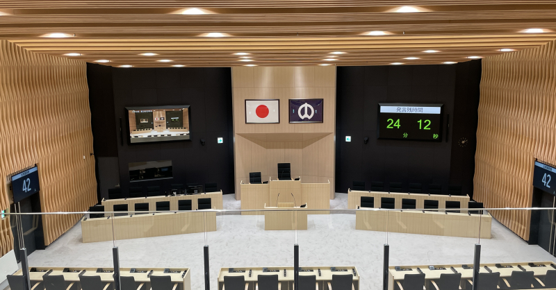 議員席:42席 執行部席:24席 記者席:有 親子室:5席